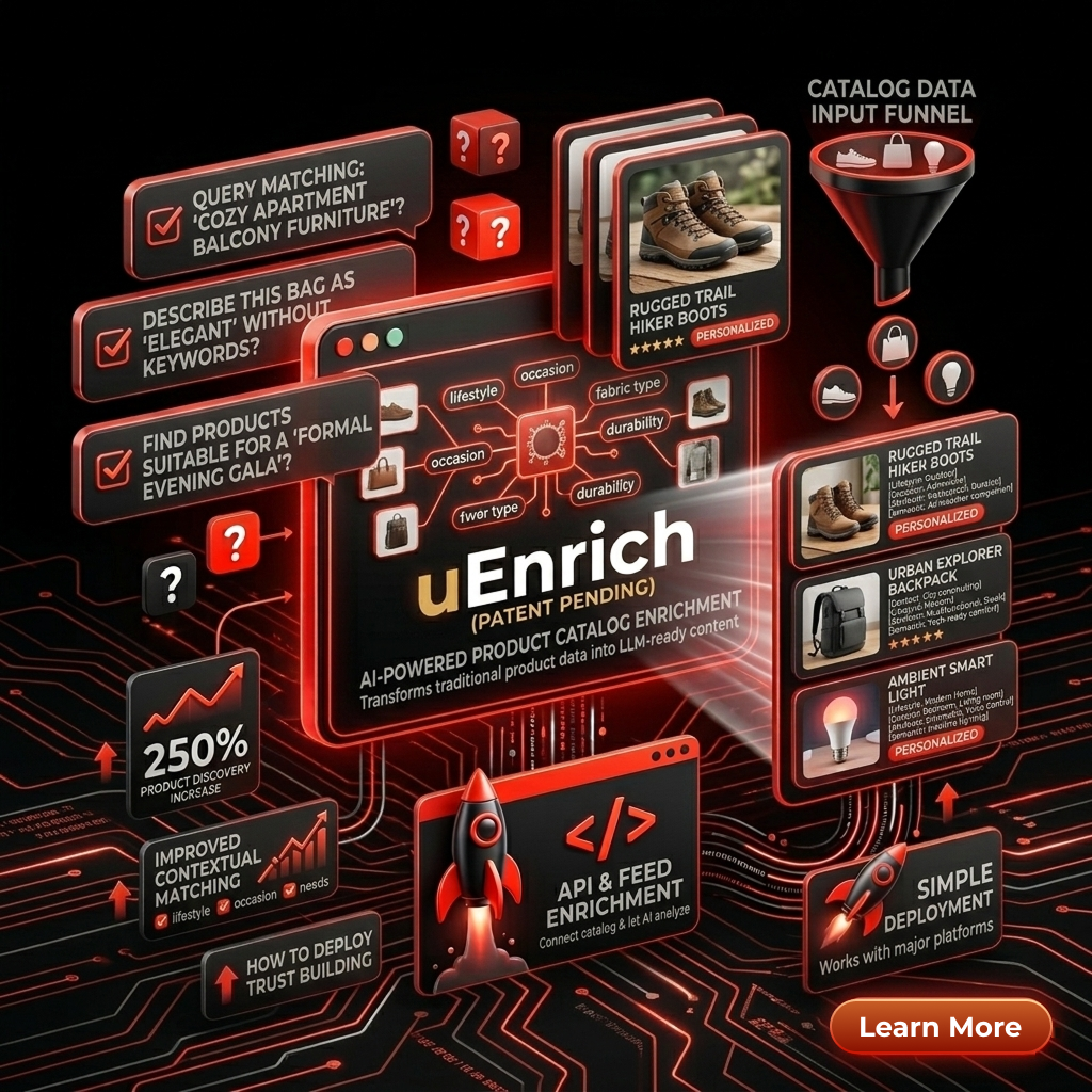 Supercharge your product catalog for the AI era. uEnrich transforms traditional product data into LLM-ready content with contextual attributes, lifestyle associations, and semantic structures that help AI find the perfect match for any customer query.