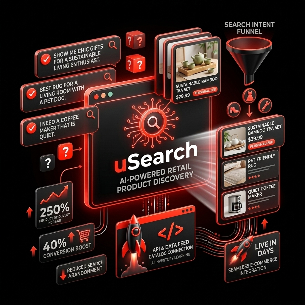 Transform product discovery with AI-powered search that understands natural language. uSearch enables customers to find products using conversational queries based on lifestyle, occasions, needs, and preferences—going far beyond traditional keyword matching.