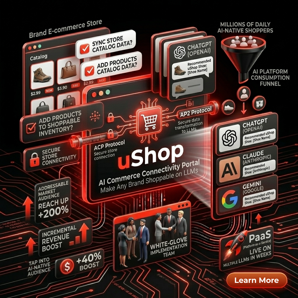 Make your store shoppable across all major AI platforms. uShop connects your e-commerce store to ChatGPT, Claude, Gemini, and other LLMs through our secure ACP and AP2 protocols, opening a new channel where millions of users shop daily.