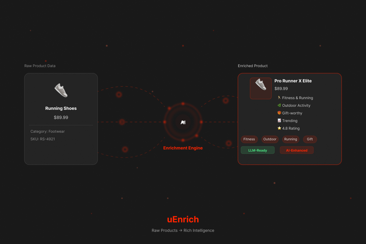Supercharge your product catalog for the AI era. uEnrich transforms traditional product data into LLM-ready content with contextual attributes, lifestyle associations, and semantic structures that help AI find the perfect match for any customer query.