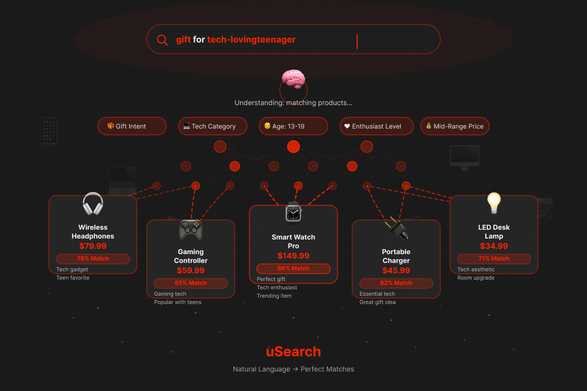 Transform product discovery with AI-powered search that understands natural language. uSearch enables customers to find products using conversational queries based on lifestyle, occasions, needs, and preferences—going far beyond traditional keyword matching.